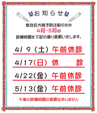集合狂犬病予防注射のため4月と5月の診療時間を変更いたします。診療予約の際はご注意ください。