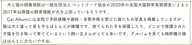 Cat Albumには当院で予防接種や避妊・去勢手術を受けた猫たちの写真を掲載していますが 、猫は犬と違って昔も今もほとんどが雑種です。捨てられた子を保護したり、どこかで保護された子猫を引き取って育てているという飼い主さんがとても多いです。アルバムを見ても純粋種の猫はほんとに少ないですね。