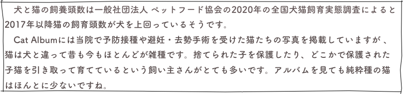 Cat Albumには当院で予防接種や避妊・去勢手術を受けた猫たちの写真を掲載していますが 、猫は犬と違って昔も今もほとんどが雑種です。捨てられた子を保護したり、どこかで保護された子猫を引き取って育てているという飼い主さんがとても多いです。アルバムを見ても純粋種の猫はほんとに少ないですね。